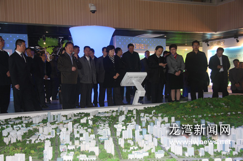 图为考察团成员在观看龙湾城市中心区沙盘。柯露霞摄