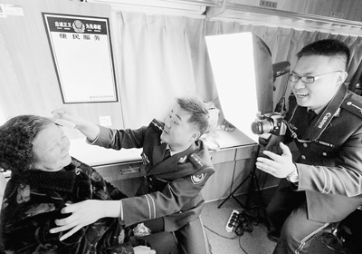 3月17日,浙江温州市龙湾区灵昆边防派出所党员在流动警务室内为留守老人办理第二代居民身份证。为继承和发扬雷锋精神,进一步密切警民关系,温州市公安边防支队组织党员官兵结合公安部部署的“三访三评”深化“大走访”活动,开展“续写雷锋日志,争当雷锋传人”主题党日活动,所属基层18个边防派出所集中为辖区留守老人开展上门办证服务。