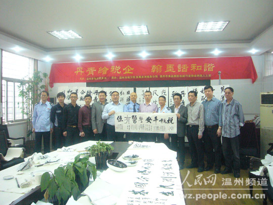 人民网温州4月23日电(记者周赛娅)挥毫泼墨宣传税法,翰墨飘香共话和谐。近日,来自温州全市地税系统和企业界的书法爱好者共聚一堂,通过书法创作宣传税收工作。