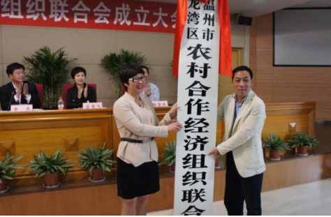 区委书记陈玲玲代表区四套班子对区农村合作经济组织联合会的成立表示祝贺,并为“龙湾区农村合作经济组织联合会”授牌。