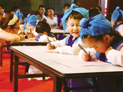 前天下午,位于温州市龙湾区沙城街道的温州孔庙举行了今年的“春泥在行动”入学开笔礼。孩子们身着古装,在老师的带领下进入孔庙大成殿,依照古礼三鞠躬祭拜孔子.老师用朱砂在儿童的眉心点上红痣,寓意为开启智慧,祝福孩子从此眼明心明,好好读书。孩子们还在孔庙里认真学写“人、从、众、孝、悌”等汉字。