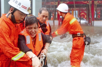 昨天中午12时许,被困游客张先生报警求助,当时整个道观被积水包围,积水最深处有1米左右,水流湍急。
