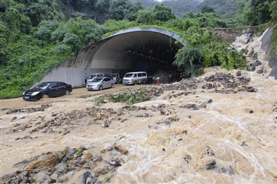 昨天,瓯海大道浃底隧道上方发生泥石流。山水原本通过隧道上方的截水沟,流向隧道口右侧排水沟。昨天上午,记者在现场看到,截水沟已被泥石封堵,水流四处乱窜,排水沟被冲毁,大量泥石堵在双向车道隧道口,交警已对事发路段进行封道。