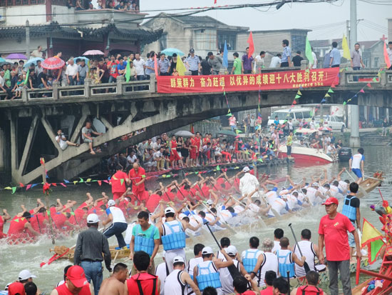 龙舟争先传斗志,状元欢歌颂党恩。现场鼓声震天、彩旗招展,各队号声洪亮、你追我赶,岸边观看的群众也激情澎湃,欢呼声此起彼伏,一片国泰民安的和谐景象。龙舟竞渡活动河段为状元桥村竞渡河段、横街村竞渡河段大岙溪村竞渡河段、三郎桥村竞渡河段等八个河段,参加此次活动的各村龙舟共有19艘,共400多名群众参加,初步估计观看喜迎“十八大”龙舟竞渡活动的群众达2万人以上,为“十八大”的胜利召开营造了奋力赶超、与时俱进的社会氛围。