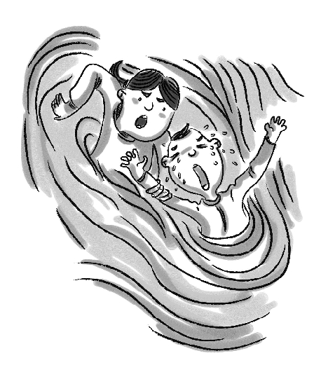 再看看身边的小弟弟,已经见不着人了,只能看到个头顶心,莹莹也慌了神,不知如何是好。万幸,这时候有个大人经过,跳进水里,把两个孩子都救了上来。