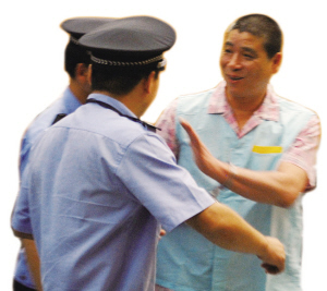 杨胜华,50岁,鹿城区人。今天上午,他穿着一件粉红色格子衬衫、黑色长裤,被法警带进法庭。粉色格子衬衫外面,是一件背面写有“鹿看”的蓝色囚服。杨胜华的家人为他从北京请来的律师,向法庭请求让杨胜华脱掉囚服,并请求让他坐下回答问题。对于律师的两个请求,法庭予以准许和同意。