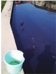 记者看到,工厂不远处就是农田,目及之处几乎全被接近蓝黑色泽的废水浸染,除了地势较高的田道上有一丝绿意之外,田里坑坑洼洼处只有一簇簇的枯草。在离工厂70米远处,两个篮球场大小的鱼塘里盛着同样的蓝黑色废水。