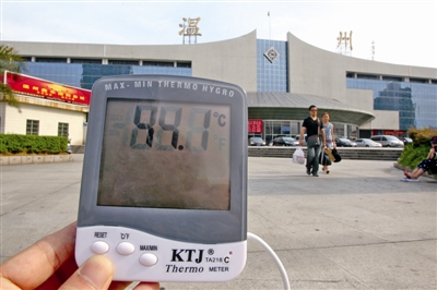 温州火车站广场上,记者选择广场上的大水池旁作为测量地点,结果显示,地面温度达到44.1摄氏度。