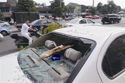 程先生的车子车顶凹陷了,后风挡玻璃碎裂。金鱼摄