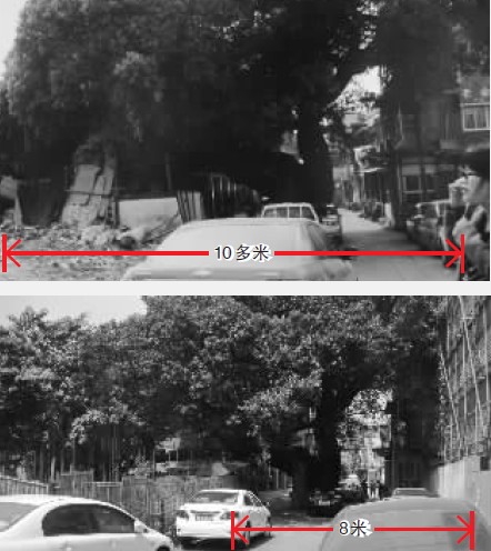 记者发现,拔地而起的8号楼确实挡住了大榕树的部分枝叶。经了解,按照规划,8号楼和9号楼间隔6米。而胡先生称,9号楼打桩时,实际上已经挪动了2米,现在间隔8米。蒋进福则指出,巷口原有10多米宽。