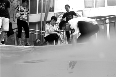 市卫生监督所的工作人员正在一个游泳馆内采集泳池水样。王诚/摄