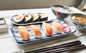 寿司、味噌汤、桃胶银耳汤