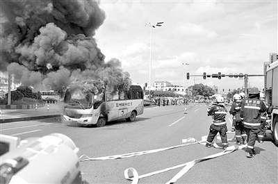 消防官兵迅速出水枪向公交车着火部位射水,同时设立警戒线,疏散过路车辆行人。10分钟后,大火被扑灭。为防止复燃,消防官兵又用撬棒敲开引擎盖,用水枪对发动机和车底盘部分进行了长时间的冷却降温。