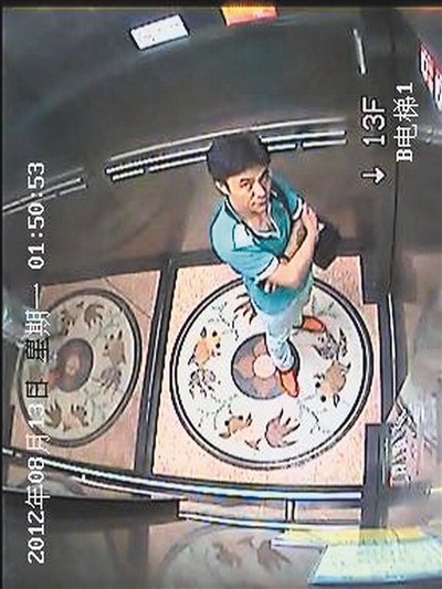 根据电梯监控录像显示,当天凌晨1时50分许,一名身穿绿色衣服、白色裤子的男子乘坐电梯下楼。该男子背着一个黑色相机包,手里拿着一部手机,乘坐电梯过程中还抬头看了一眼电梯上方的电子眼。