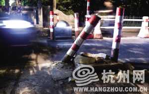 昨天19:55,网友“不戒禅院”发微博说:“老德胜桥两端各有2个石礅用来防止大型车过桥,其宽度刚好容小轿车过去。晚上遛儿子的时候,看到一辆浙G的福特车脑袋顶在石礅上,撞得还挺严重,连转向杆都断了,这得多自信的技术才能在这里开这么快啊。”