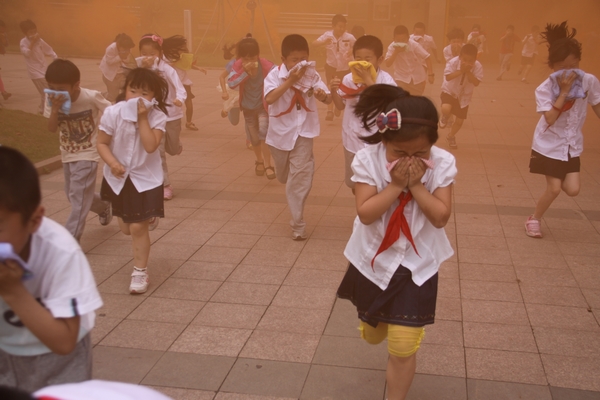 随着一阵急促的警报声,“同学们,用毛巾把嘴巴和鼻子捂好了,弯下腰低着头跟着老师走……”,只见小学生们在老师和官兵的指导下,捂着口鼻迅速有序的从楼梯、疏散通道向学校操场转移。整个逃生过程紧张有序的进行着,900多名师生仅用了极短的时间就全部疏散到了安全地带。