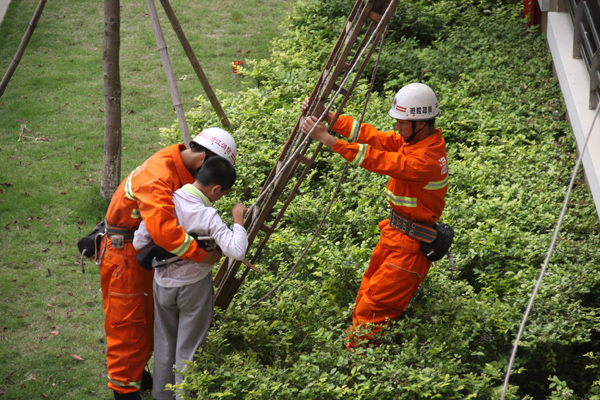 3分钟后,永宁中队消防官兵赶赴现场。中队指挥员迅速与学校负责人取得联系并询问现场详情,在了解情况后迅速成立警戒小组、侦查救援小组、供水小组,以及灭火小组进行战斗,“火势”很快得到控制,同时,永宁中队官兵们,利用六米拉梯和救援担架,成功营救出被困在教学楼内的3名学生。