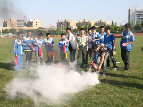 龙湾新闻网讯 绿意盎然的草坪上,龙湾实验中学的师生正在接受一场特殊的“教育”。他们在“绿军装”老师的讲解下,了解关于火灾的知识,学习如何预防火灾,如何使用灭火器等与生命财产息息相关的知识。一位学会了使用灭火器的同学说:“这是很有意思的一堂课,这种“刺激”的实战演练,让我足足的过了一把“灭火瘾”。