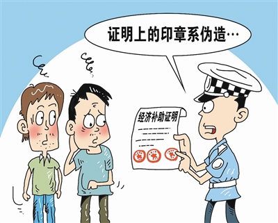 民警随即赶到现场,发现两个乞丐中,那个残疾的拿着一份“经济补助证明”,上面写明他因残疾无劳动能力,经有关政府、村委会及老人协会核查属实,请好心人解囊援助,落款还盖有枫林镇政府、枫四村委会及老人协会的印章。民警经仔细辨认,确定证明上的印章系伪造,便将两人传唤至派出所进一步调查。