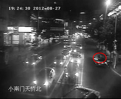 根据警方提供的监控显示:8月27日晚上7时24分20秒左右,雪佛兰轿车打了一把方向,欲从出租车右侧绕过去,一男子(即张师傅)挡在车子前面边拦边退,对方却仍然继续前行,男子飞身扑上车子的引擎盖,被驮着拐向了府前街(如图)。