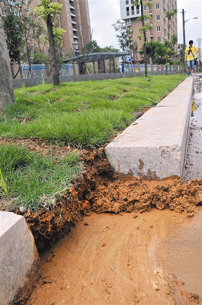 日前,记者在该小区附近找到了所谓的“神奇”绿化带,该绿化带近百米长,上面铺设着一块块方块草皮,还零星种有小树。经观察,几处草皮已枯黄,数棵小树也出现了枯死的状态。记者随机掀开3处草皮,1处直接惊现带有横纹的水泥地,2处培有泥土,但用木棒剖开土层,便可看到水泥地,培土厚度均只有10多厘米。总体观察,绿化带草坪厚薄不一,有些20厘米左右,有些不足10厘米;小树种植点的培土明显高于草坪,明显可见另有泥土垫高。