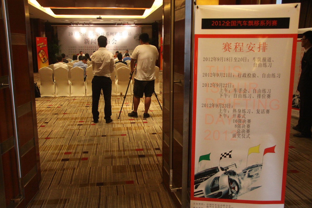 图为2012年全国汽车飘移系列赛温州站新闻发布会现场。