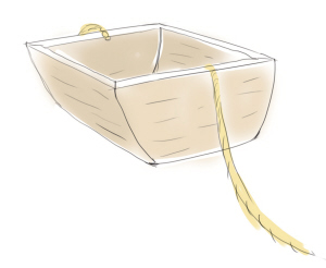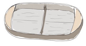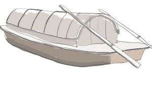 它一米八见方,船两端用长长的抽绳连接在河岸两边的树桩或石礅上。不用时,绳子沉于水底,空出河面方便其他船只通行。乘船时,人坐船上,用力抽拉目标方向的绳子,缓缓把船只挪至对岸。