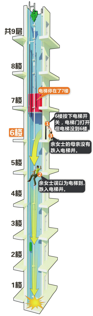 余女士的婆婆是最先赶到1楼的。在1楼的电梯井里,余女士趴在地上,双手朝着儿子。儿子仰躺在旁边,大哭。