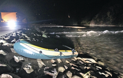 事发河道水流湍急,出事的充气艇停在岸边。记者 蒋超/摄