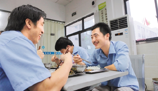 刘厚龙(左一)和工友们正边吃饭边听广播。董时纲 摄