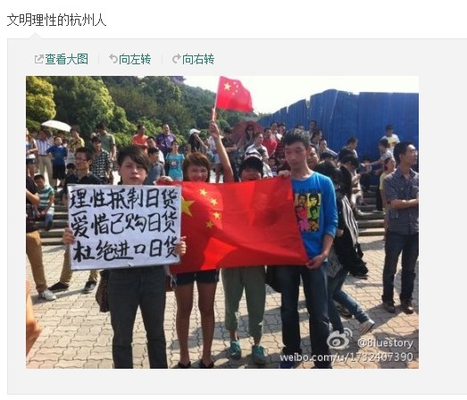 今日之世界是2012年之世界。中国人民不仅站起来了,更已文明起来。捍卫国家主权必须要理性,反日示威切切不可暴徒化。砸毁、破坏日货或店铺,泄愤式表达徒招天下耻笑,且正中日本右翼政客奸计。浙江必须向打砸抢说不。我们为理性爱国叫好!