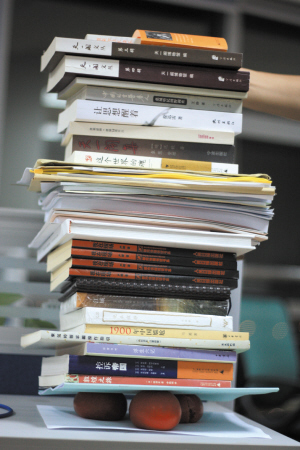 找不到书了,记者从办公室的书柜上拿了十来本书,先放上去5本。