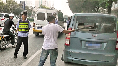 浙江在线09月21日讯 9月19日上午,市区新南站前上演了一幕街头惊险剧:一位壮汉操着铁棍使劲砸向一辆面包车后挡风玻璃,边上几位运管稽查人员不停劝他冷静。