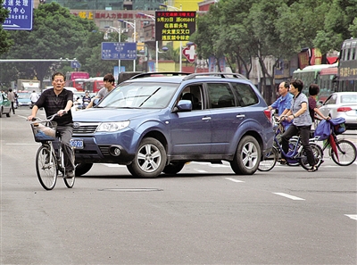 市民林女士每天都要从公园路的单位骑车到龙泉巷接上幼儿园的女儿放学。林女士说,大部分家长开车接孩子,将学校一带堵得一塌糊涂,自行车很难骑。而骑过斑马线、路口,随时要提防飞速而过的汽车,真是提心吊胆。