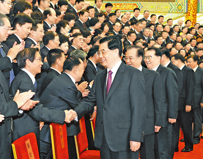 下午3时30分许,胡锦涛等中央领导同志来到人民大会堂金色大厅,同出席大会的代表见面,全场响起热烈的掌声。胡锦涛等高兴地与代表们亲切握手交谈,并同大家合影留念。