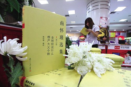 温州书城里,工作人员将南怀瑾先生所著的书籍摆放在显眼位置并放上菊花以示缅怀之情。刘伟/摄