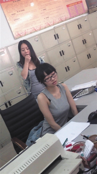 永强房管所3号窗口,一名穿牛仔外套的女子,正在吃饼干等零食。视频截图
