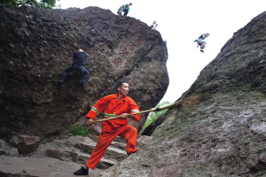 山顶上,不远处传来了“唰唰唰”的声音,一个橙色的身影,从山石间一步一步往上移。早锻炼的老人和他擦肩而过,很随意地打了声招呼:“早啊,余师傅!”