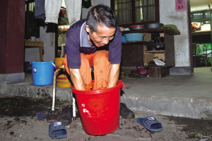 在宝石山脚下的住处,吃完晚饭的余师傅在水桶里洗脚,缓解一天的疲劳。