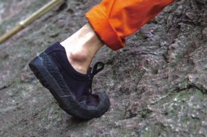余师傅在岩壁上都是踮着脚尖走,他说这样踩得牢,可以防滑。