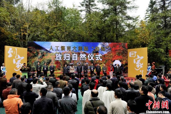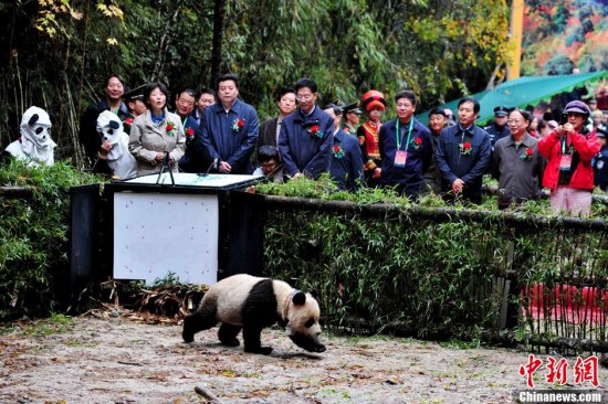 中新社石棉10月11日电 2岁零2个月的大熊猫“淘淘”11日被放归四川雅安市石棉县栗子坪自然保护区。这是中国第二次对大熊猫进行野放。