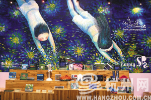 看完了书,起身转个弯,是我很喜欢的漫画家几米展区,以蓝色调《星空》漫画为主题,摆了好些几米的画册、雕塑、相架、笔记本,还有时尚的iPad、iPhone的壳,女孩子们看了,保证喜欢。