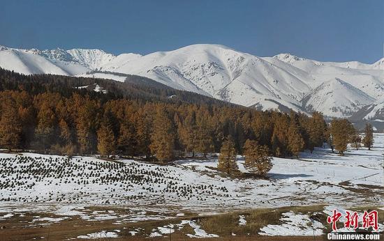 随着秋季到来,西伯利亚冷空气随之进入新疆各地,记者13日途径新疆巴里坤县、伊吾县境内时,看到天山东部局部区域已被白雪覆盖,金黄的落叶松在皑皑白雪及蓝天白云间显得格外耀眼。据介绍,由于冷空气入侵和山区地势的原因,新疆东天山区域出现降雪天气,气温也随之降至10摄氏度以下,夜晚气温接近0摄氏度左右。刘新 摄