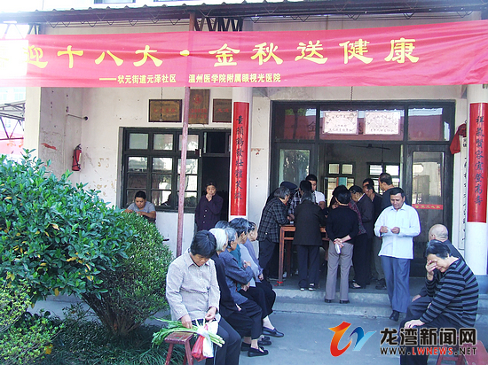 龙湾新闻网讯 为大力推进社区服务工作,关注社区老年人的眼科健康,近日,状元街道元泽社区开展“喜迎十八大、金秋送健康”眼科免费义诊活动。元泽社区指导员陈雪如邀请了温州医学院附属眼视光医院防盲治盲办公室涂昌森主任,李锦阳博士、赵泽林医师等8名医疗普查人员来社区坐诊,让老百姓不出远门就能享受到市级医疗专家服务水平,确保社区一些老年性白内障能及时得到有效治疗。