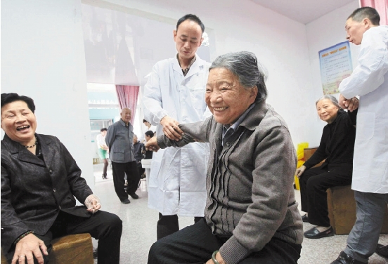 10月23日,81岁的许庆玉在温州龙湾区龙康社区居家养老照料服务中心接受免费推拿服务,她高兴地说,现在方便了,以后有空就来这里推拿,以缓解她的头痛病。陈晓彬黄秀平摄