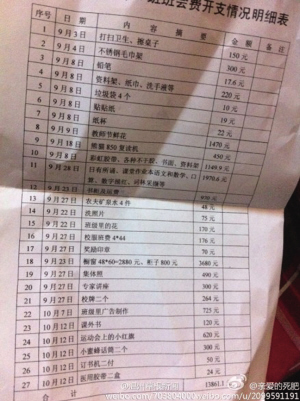 为了让所有的家长都知道钱的支出情况,家长委员会打印了这张明细表,给每个学生带回去给家长看。没想到流传到了网上。