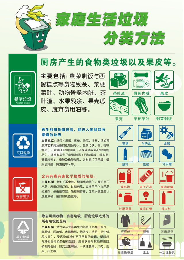 家庭生活垃圾大致可以分为餐厨垃圾、可回收垃圾、有害垃圾、其他垃圾等四个种类,在众多应对生活垃圾处理的举措中,垃圾分类被认为是垃圾减量化、无害化、资源化的最有效的措施之一。龙湾城管与执法局工作人员介绍说,希望通过此次垃圾分类试点宣传活动,让更多的人养成垃圾分类的好习惯,使生活垃圾达到“减量化、无害化和资源化”的目标,力争使我区环卫水平跨入国家级卫生、文明城区的行列,成为环境优美的现代化“生态城区”。