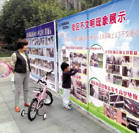 最近,朗诗国际小区门口的一块展示板特别醒目,上面全是小区里的各种不文明现象,“机动车非机动车占道停放”、“公共区域设施设备损坏”、“宠物随地大小便”、“公共区域占用,无序堆放杂物”、“楼体外悬挂物易发生高空坠物”……