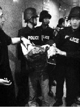 歹徒打算进入1303房间,从这里逃走,谁知刚进入房间,就被早已埋伏在那的特警擒获了。警方随后找到了那支“枪”,发现只是一把塑料玩具枪,已经摔碎。下午4点55分,蒙着头罩的歹徒,被特警押出了华都大厦。