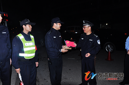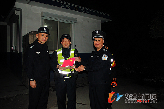 龙湾新闻网讯 10月31日晚,龙湾永兴派出所南北桥村桥头治安岗亭警灯闪烁,热闹非凡,区委常委、公安分局局长李伟带领相关部门负责人组成“送旗队伍”,为桥头治安岗亭执勤民警送来象征荣誉的“红旗”。